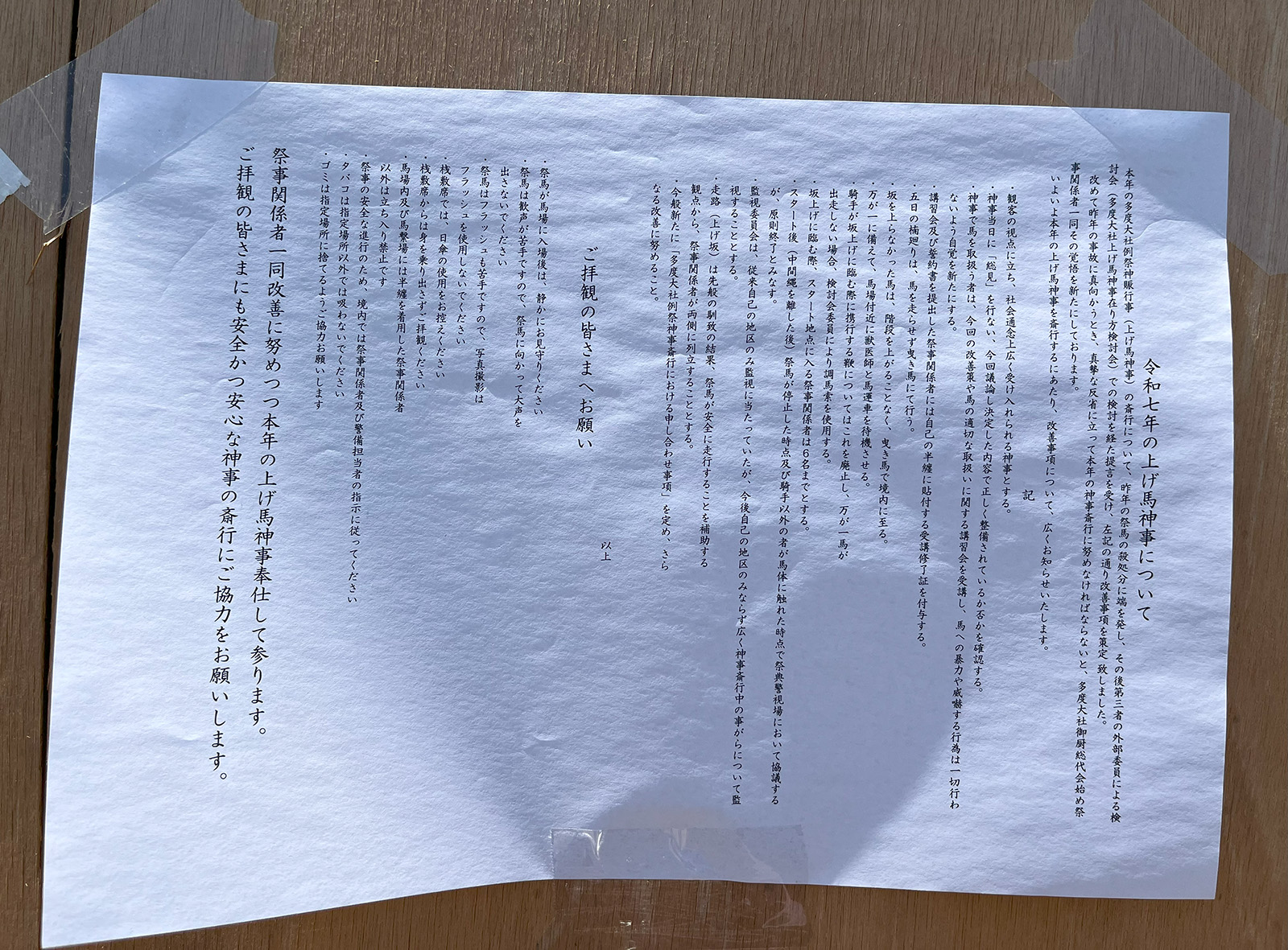 動物虐待での告発については、これ以上のことはできませんが、議決の通知には、「慎重に審査した結果、本件上げ馬神事の開催を決定し、祭馬を同神事に出走させた行為は、社会全体で動物愛護意識が高まり、動物虐待に対する罰則が強化された現代社会においては、動物虐待という疑いは残るものの」との言葉がありました。